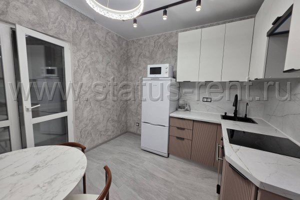 В квартире сделан качественный евроремонт. Просторная кухня площадью 10 кв. м: встроенный кухонный гарнитур, вытяжка, СВЧ, холодильник, стол обеденный, стулья.