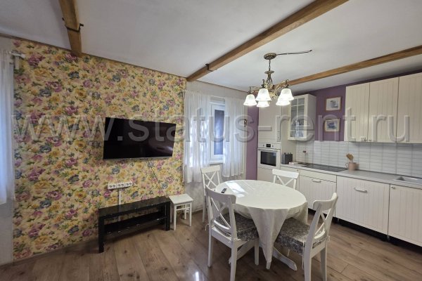 Кухня-гостиная 26м2: встроенный кухонный гарнитур, вмтроенная варочная панель стеклокерамика, встроенный духовой шкаф, встроенная посудомоечная машина. Круглый обеденный стол, стулья. Большой холодильник с распашными дверями.