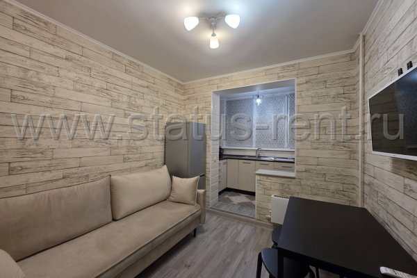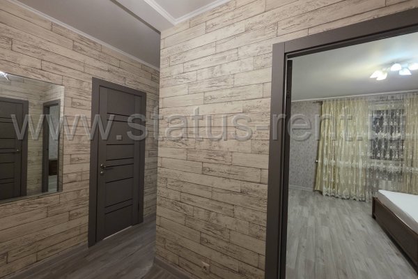 На кухне: встроенный кухонный гарнитур, встроенная варочная панель из стеклокерамики, СВЧ, электрочайник, холодильник, стол обеденный, табуреты, ТВ -ЖК. Для комфортного проведения времени, на кухне предусмотрен раскладной диван с подушками. Совмещенный санузел: плитка, ванна, унитаз, зеркало, стиральная машина-автомат. Комната: двуспальная кровать, матрас, тумба прикроватная, стенка- горка для хранения вещей. В квартире имеется оборудованная гардеробная, что избавляет от громоздких шкафов. Прихожая: вешалка для верхней одежды, стойка для обуви.