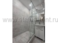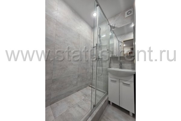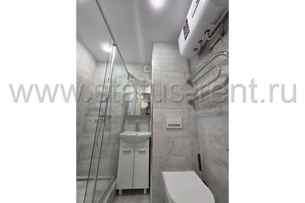 В санузле построена душевая кабина. Установлено зеркало со шкафом для хранения, раковина с тумбой, подвесной унитаз с инсталяцией, гигиенический душ, бойлер (сезонное отключение горячей воды вас не коснётся).