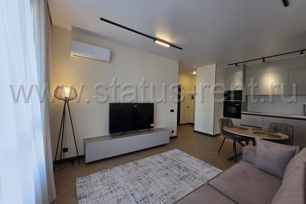 Зона гостиной: удобный раскладной диван с подушками, тумба с ящиками для хранения, ТВ ЖК. Кондиционер. Зона кухни и гостиной оснащенны вариантами освещения.