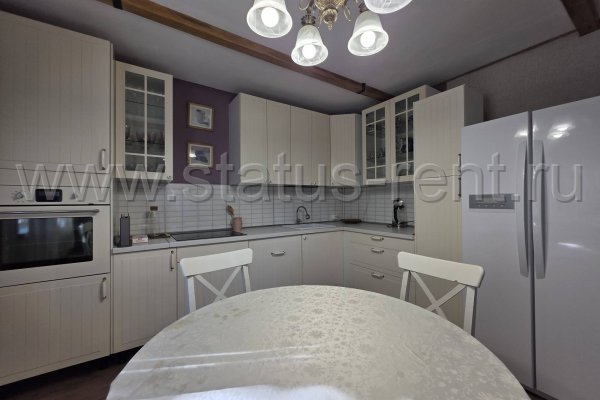 Кухня-гостиная 26м2: встроенный кухонный гарнитур, вмтроенная варочная панель стеклокерамика, встроенный духовой шкаф, встроенная посудомоечная машина. Круглый обеденный стол, стулья. Большой холодильник с распашными дверями.