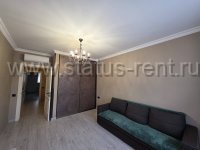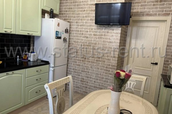 Кухня 12м2: встроенный кухонный гарнитур под единой столешницей, вытяжка, встроенная варочная панель стеклокерамика, встроенный духовой шкаф. Стол обеденный, стулья. СВЧ. Холодильник. ТВ ЖК. Кухня просторная, позволяет установить дополнительное место для отдыха. На кухне имеется большая застеклённая лоджия.